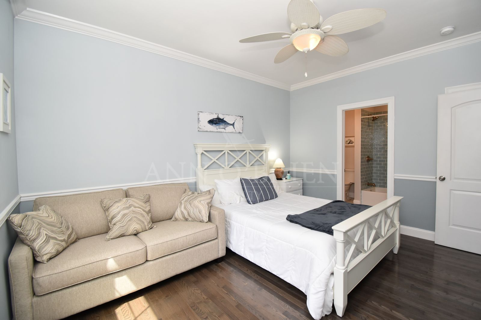 A quiet beach house located close to South Kingstown Town Beach and Matunuck Beach restaurants and bars. A short drive to Narragansett and Newport. The house includes a primary bedroom with a king size bed, a large bathroom with a huge walk in shower and closet, plus a TV. The second bedroom has a queen size bed, en suite bathroom and walk in closet as well. There is a third room off the kitchen with a pull out couch and full sized washer and dryer. The living room also has a full size sofa bed